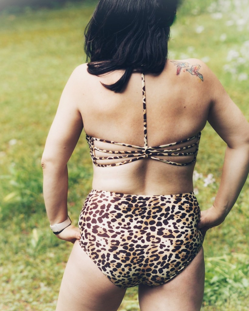 The high waisted bottoms (once again I’m wearing a medium) are perfect for the mom bod, and the strappy back bikini top (I’m a 36D and I’m wearing a large) is seriously SO GOOD. This mama is bringing sexy back, in leopard print of course.